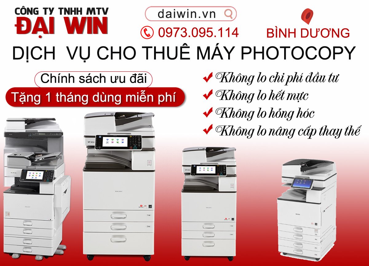 Nếu quý khách đang có nhu cầu dùng máy photocopy ở công ty, cửa hàng, văn phòng,…Hãy liên hệ Đại Win hotline: 0973095114 Để được tư vấn và chọn thuê máy photocopy giá tốt nhất tại Bình Dương các khu vực như: Bến Cát, Dầu Tiếng, Dĩ An, Phú Giáo, Tân Uyên, Thuận An, Thủ Dầu Một.