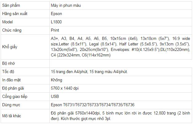 Máy in phun màu Epson L1800 sử dụng 6 màu mực để in ấn, vì vậy màu sắc trên hình ảnh được thể hiện rõ nét, trung thực. Máy in phun màu Epson L1800 sử dụng kết nối USB để tương tác với các thiết bị ngoài.